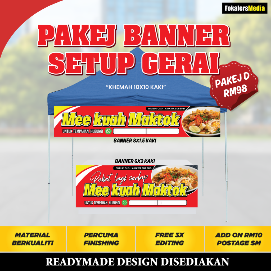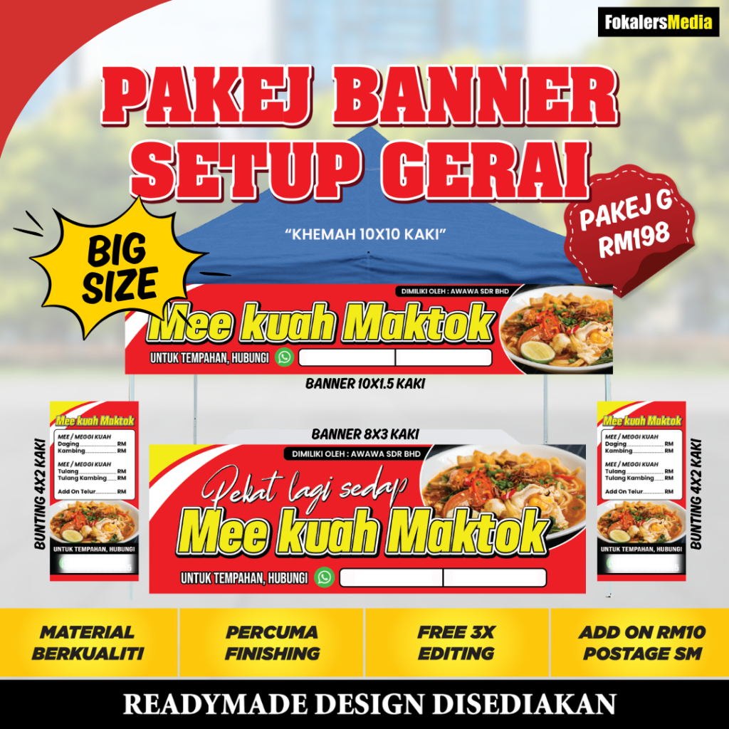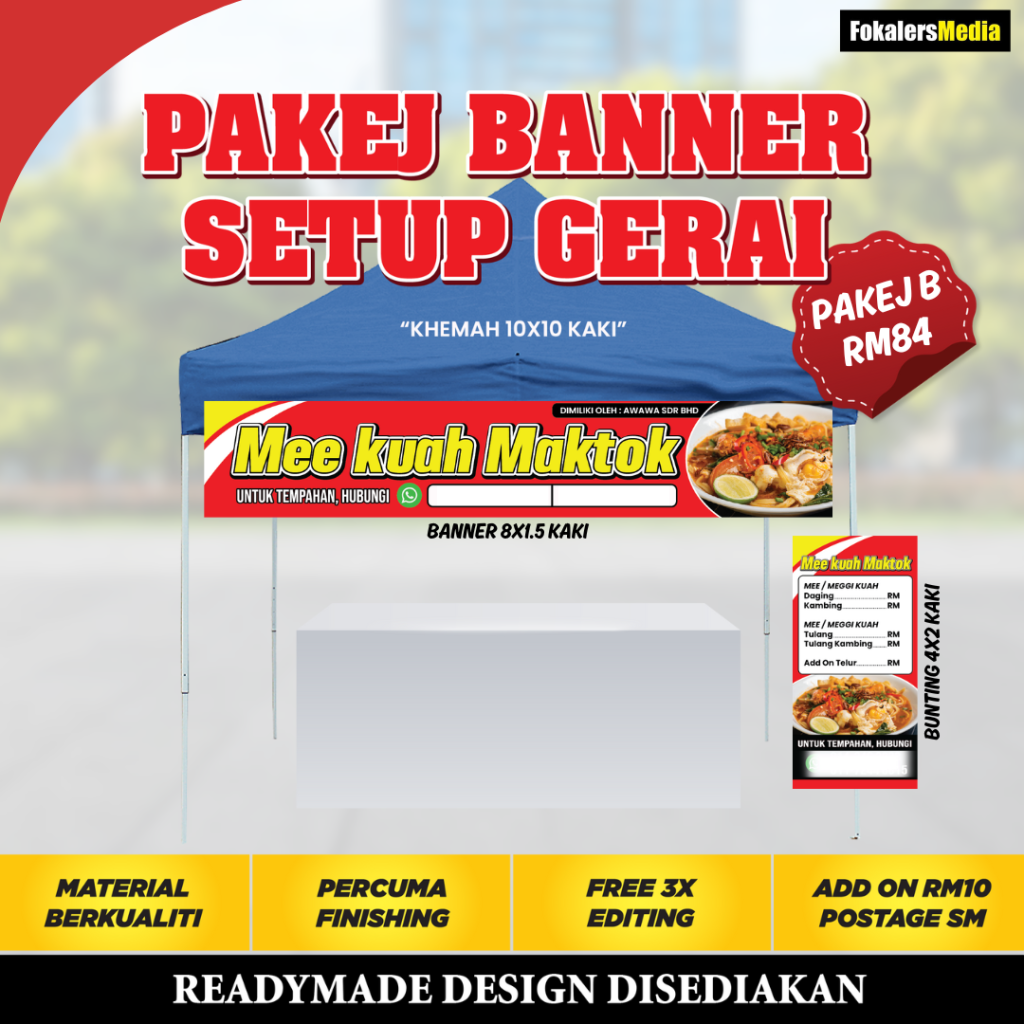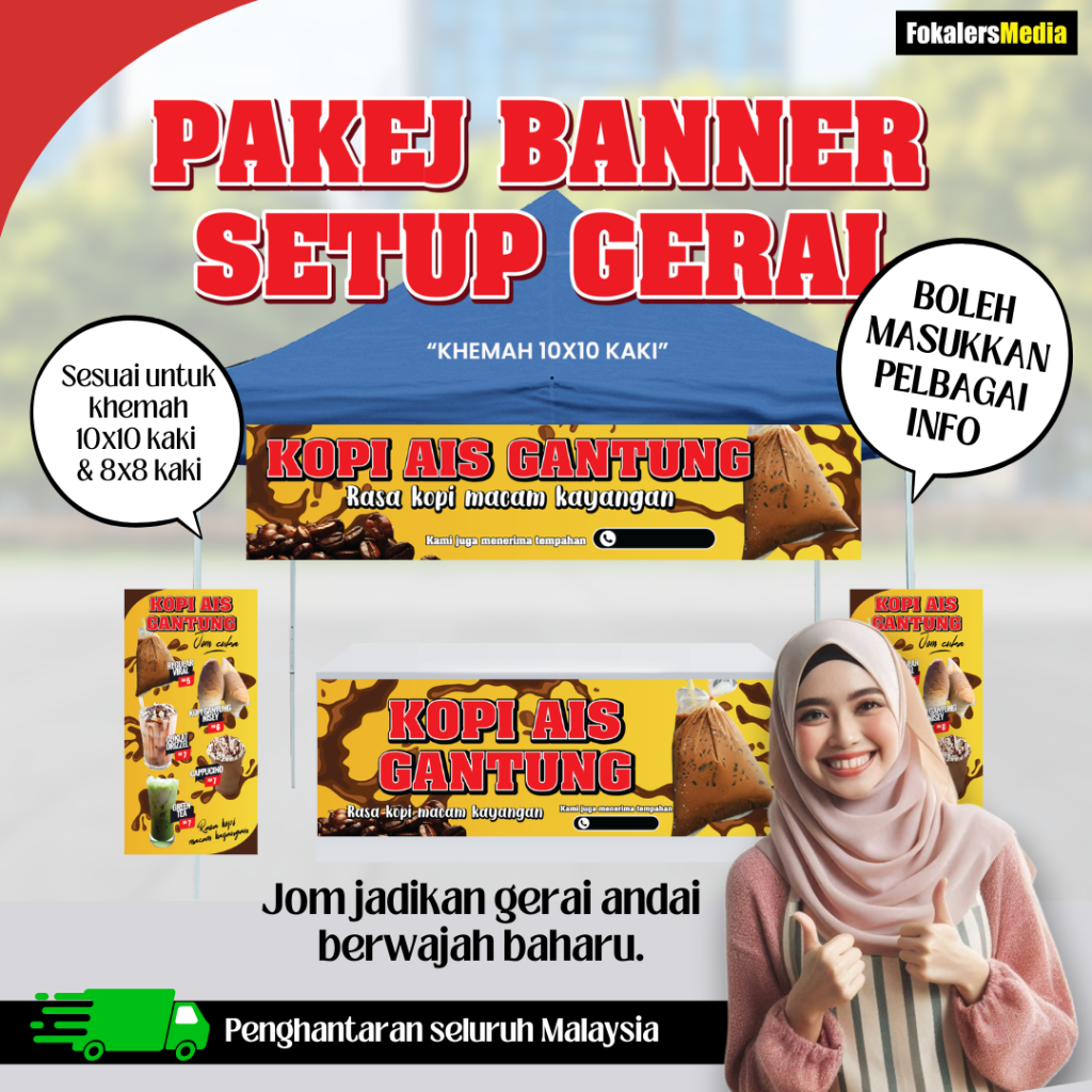 Kami boleh bantu! Pasang je Banner Setup Gerai yang lengkap ni. Nescaya... GERAI AKAN TAMPIL LEBIH MENARIK Dari jauh orang dah nampak gerai kita jual apa. , )