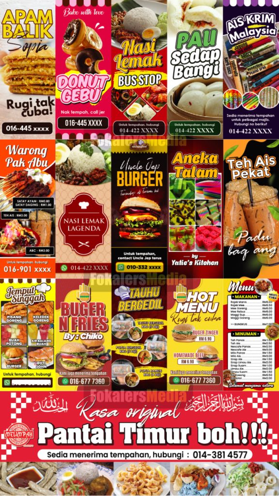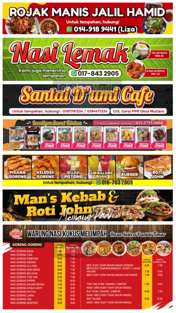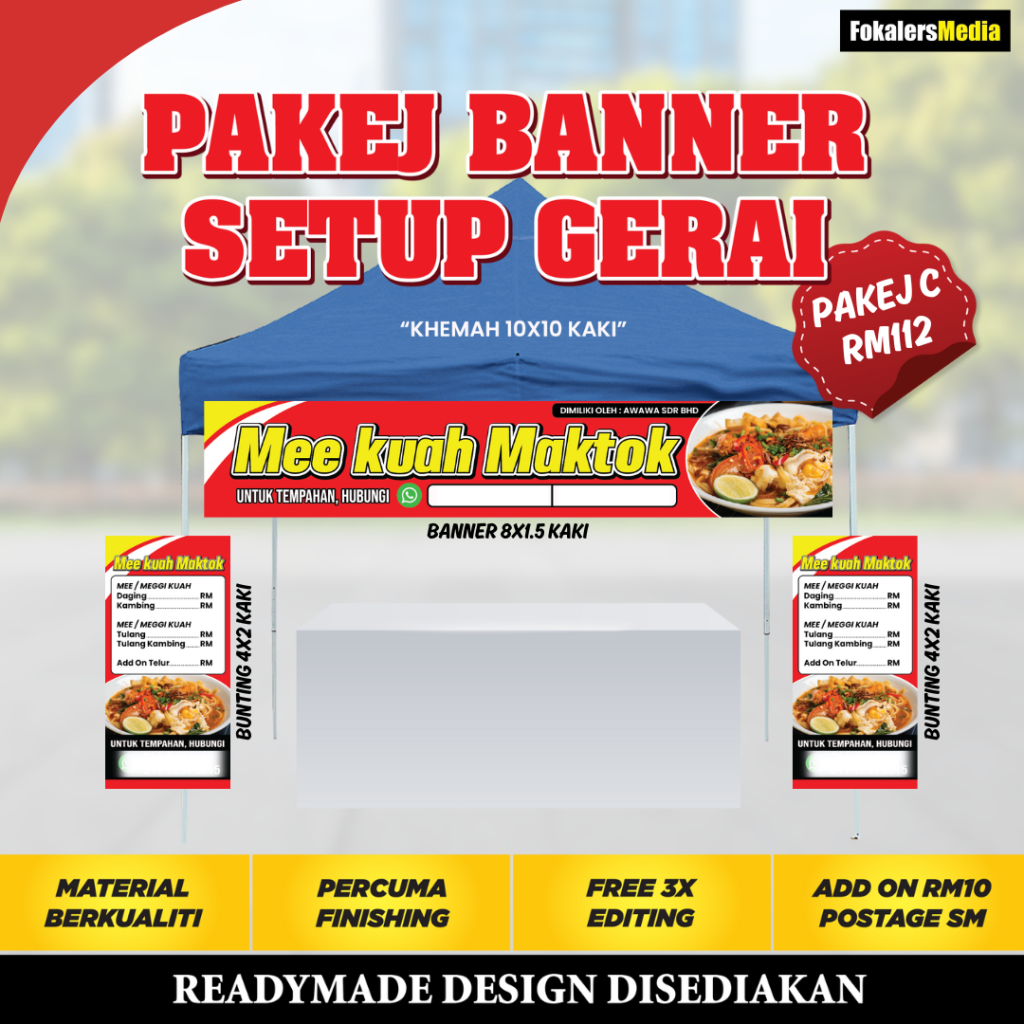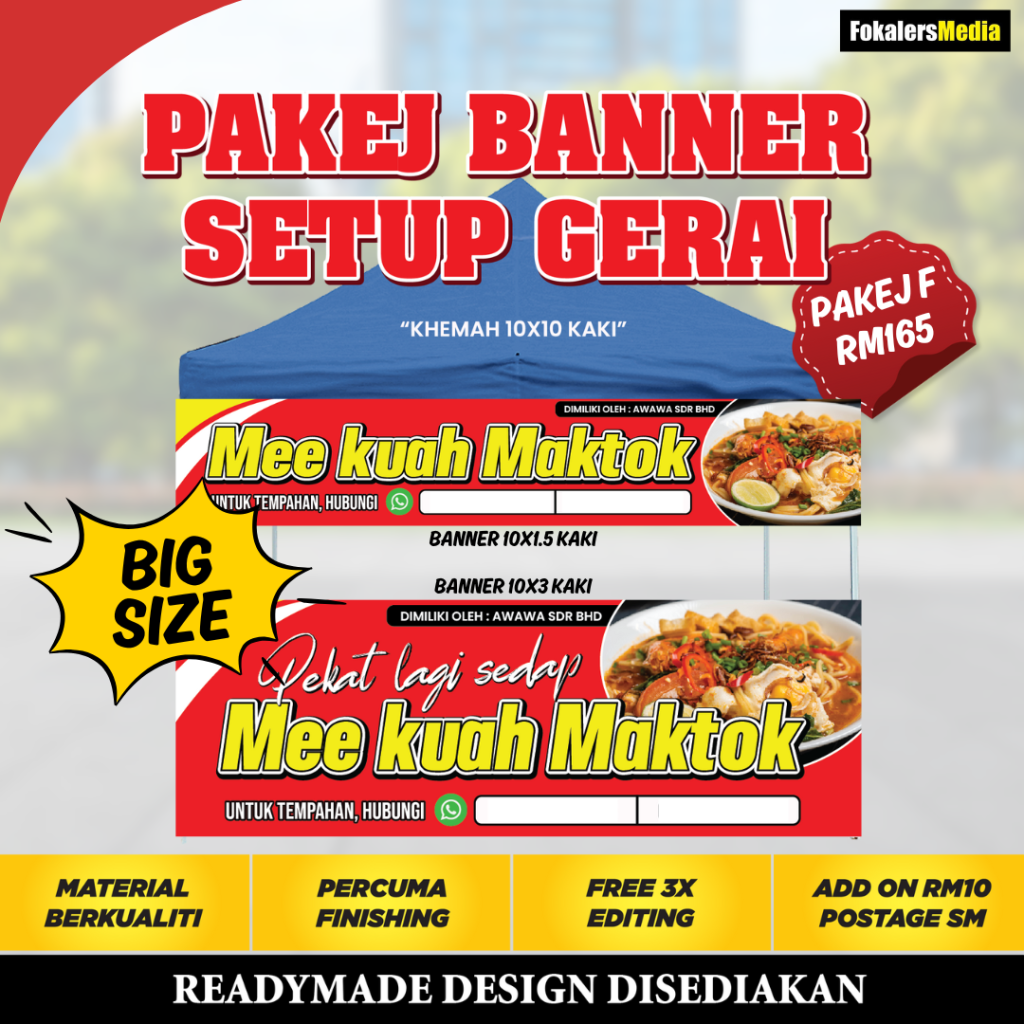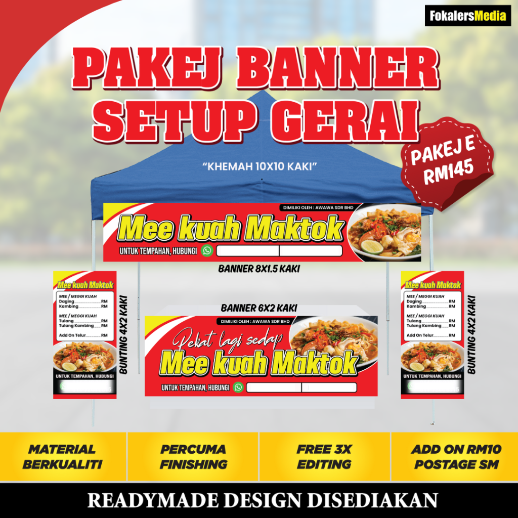 Kami boleh bantu! Pasang je Banner Setup Gerai yang lengkap ni. Nescaya... GERAI AKAN TAMPIL LEBIH MENARIK Dari jauh orang dah nampak gerai kita jual apa. , )